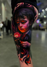 Her passion for color and realism emerged two years ago, combining her experience with oil painting and tattooing techniques. Her pieces are characterized by a delicate interplay of light, contrast, and movement, especially in portraits, where she captures the essence and emotions of each subject.